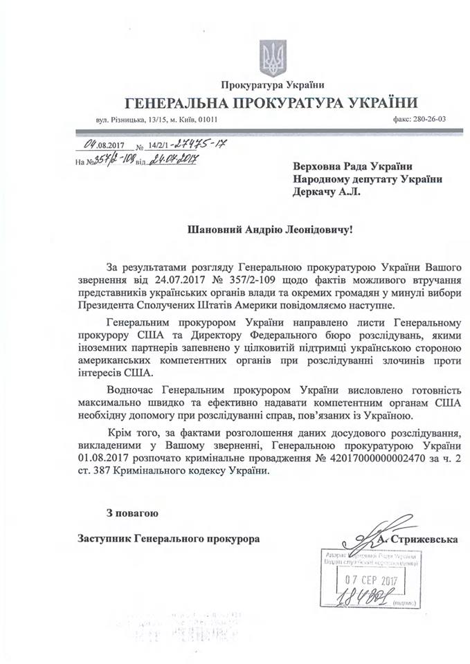 В нем отмечается, что открыто производство №42017000000002470 по части 2 статьи 387 Уголовного кодекса Украины.