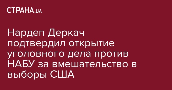 Внефракционный нардеп Андрей Деркач подтвердил, что Генеральная прокуратура Украины открыла уголовное производство по факту вмешательства сотрудников Национального антикоррупционного бюро Украины в выборы президента США в 2016 году. Об этом он сообщил на своей странице в Facebook.
