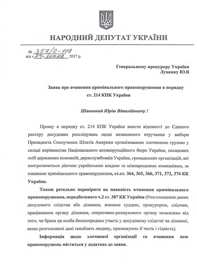 "По мнению экспертов и журналистов, в период необъявленной войны со стороны Российской Федерации последовательная и твердая поддержка США жизненно необходима для защиты национального суверенитета и территориальной целостности Украины. Только прозрачное и тщательное расследование фактов незаконного вмешательства украинских должностных лиц в избирательную кампанию США может восстановить доверие стратегического партнера к Украине", - резюмировал он.