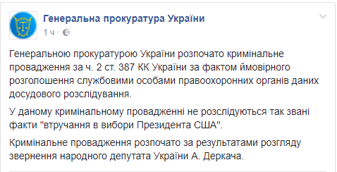 Генеральная прокуратура опровергла ведение расследования по вмешательству Украины в выборы президента США. Об этом сообщается в Facebook ведомства.