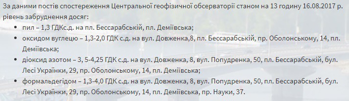 По результатам исследований, наихудшие показатели были зафиксированы в районе Бессарабской и Демеевской площадей, а также проспектов Победы и Оболонского.