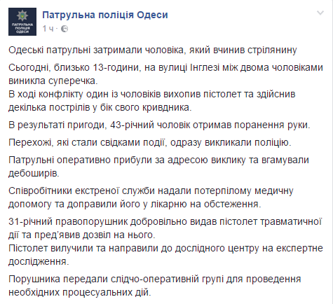 Об этом сообщили в пресс-службе патрульной полиции Одессы. В результате происшествия, 43-летний мужчина получил ранение руки. Прохожие, ставшие свидетелями происшествия, сразу вызвали полицию.