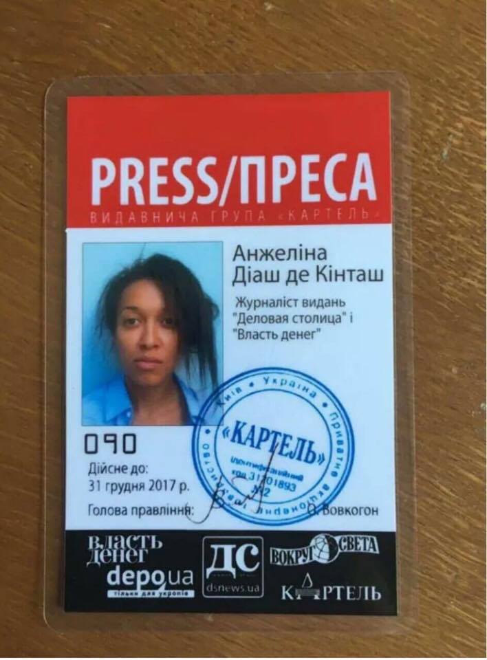 Как сообщалось официально на сайте издания "одна из якобы журналисток пришла по фальшивому удостоверению издательской группы "Картель", в состав которой входит "Деловая столица". ЧАО "Картель" сообщает, что удостоверение данной особе никогда не выдавалось и удостоверение под этим номером принадлежит нашему штатному сотруднику. Удостоверения издательской группы имеют другой вид - они являются пластиковыми, а не ламинированными. Удостоверение под номером 090 было выдано заместителю главного редактора изданий "Деловая столица" и "Власть денег" Ольге Сантарович, а не Анжелине Диаш де Кинташ, как указано в поддельном документе".