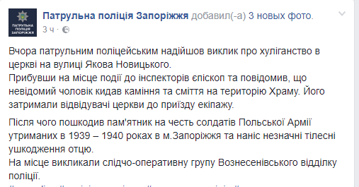 В Запорожье вчера, 16 августа, мужчина повредил памятник возле католического храма на улице Якова Новицкого. Об этом сообщает пресс-служба патрульной полиции.