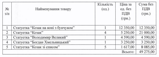 За 15 тысяч гривен для парламента закупят бронзовую статуэтку "Лев и козак". А еще один набор статуэток для подарков (скульптуры козаков, Богдана Хмельницкого и Владимира Великого) обойдется в 50 тысяч гривен.
