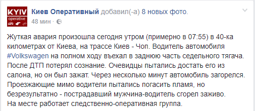 На трассе Киев-Чоп в жутком ДТП заживо сгорел водитель