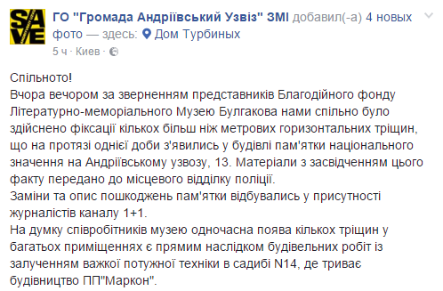 "Вчера вечером по обращению представителей Благотворительного фонда Литературно-мемориального музея Булгакова нами совместно были осуществлены фиксации нескольких более метровых горизонтальных трещин, которые в течение суток появились в здании памятника национального значения на Андреевском спуске, 13. Материалы с удостоверением этого факта переданы в местный участок полиции”, - говорится в сообщении.