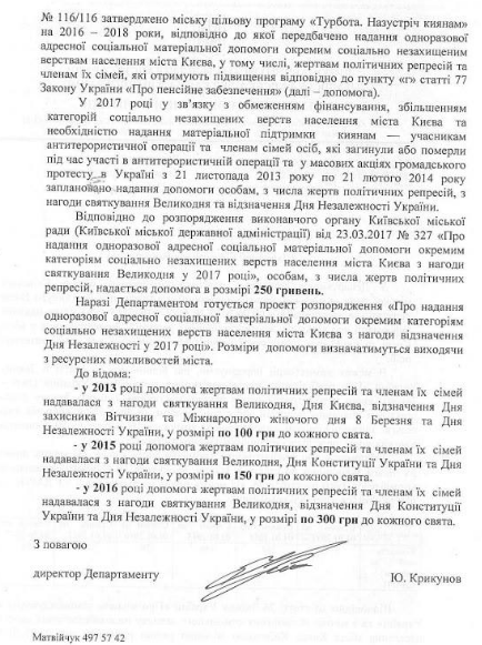 При этом депутат приложил фото ответа на его запрос из Департамента соцполитики КГГА,в котором отмечается, что из-за ограниченного финансирования и увеличения количества социально незащищенных граждан Киева (за счет участников АТО, их семей и лиц, которые принимали участие в массовых акциях протеста времен Майдана) в 2017 году единоразовые выплаты жертвам репрессий составят 250 гривен. В 2016 году сумма такой помощи была 300 гривен.