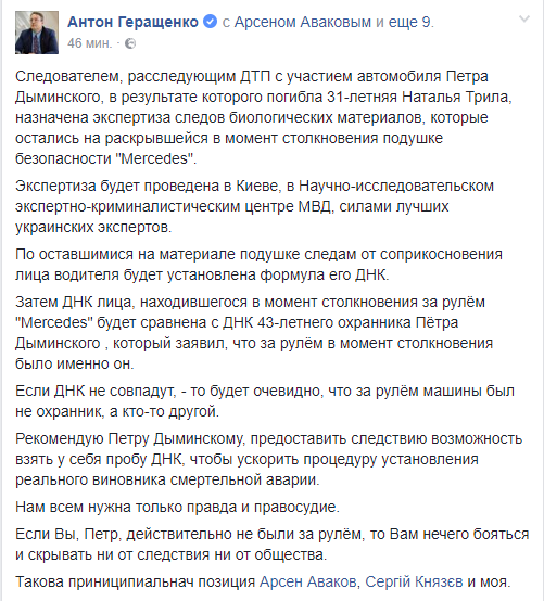 "По оставшимися на материале подушке следам от соприкосновения лица водителя будет установлена формула его ДНК. Затем ДНК лица, находившегося в момент столкновения за рулём "Mercedes" будет сравнена с ДНК 43-летнего охранника Петра Дыминского , который заявил, что за рулем в момент столкновения было именно он", - пишет Геращенко.