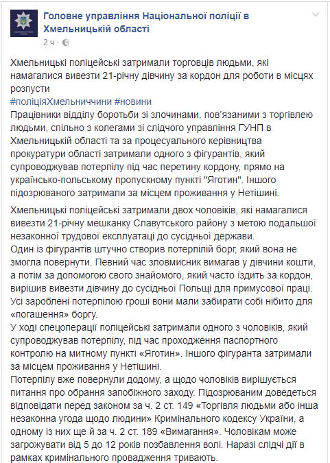 В Хмельницком задержаны мужчины, которые пытались вывезти 21-летнюю девушку, жительницу Славутского района, в сексуальное рабство в Польшу. Об этом сообщили в пресс-службе местной полиции.