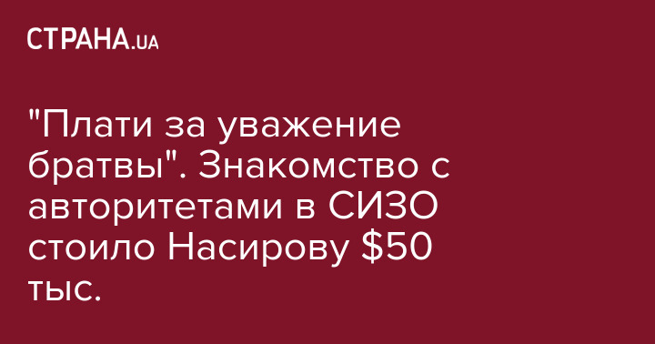 Ранее эти же имена назвал "Стране" источник в Лукьяновском СИЗО: "Это смотрящие по Лукьяновке от воров "Недели" и "Лёры Сумского". Смотрящие – не из "спортсменов", а из числа блатных. Смотрящие фактически держат под контролем весь СИЗО, негласно им разрешено свободно перемещаться по всему изолятору в любое время. Администрация СИЗО неофициально сотрудничает со смотрящими и решает вопросы откатов себе от "грева" - финансовой помощи заключенным с воли. Размеры откатов администрации – от 30 до 40% от всей суммы. Ваш Насиров сидел в привилегированной "хате", оборудованной по высшему классу. Там есть отдельный душ с бойлером, теплый туалет облицованный плиткой, плазменный телевизор, интернет-роутер. Цена за место в такой хате от 5000 долларов в месяц. Деньги за "постояльца" передают кэшем лично хозяину изолятора. За "место" для Насирова проплатили вперед за месяц, плюс Рома пожертвовал на "грев" арестантам полтинник "зелени" (50 тысяч долларов). Его никто не прессовал и не давил, что бы он подкинул денег. Его доверенные люди сами перечислили сумму нужным людям".