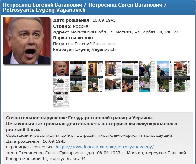 Советский и российский артист-юморист Евгений Петросян попал в базу скандального сайта "Миротворец" из-за гастролей в аннексированном Крыму. Об этом сообщается в базе сайта "Миротворец" в разделе "Чистилище".