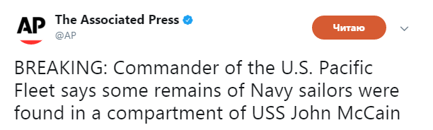 Как сообщала "Страна", эсминец "Джон Маккейн" понес существенный урон от столкновения с танкером. После этого он пришвартовался на военной базе в Сингапуре. Корабль добрался до базы своим ходом. И это несмотря на то, что получил большую пробоину задней левой части корпуса. Несколько отсеков корабля были затоплены. Десять моряков пропали без вести.