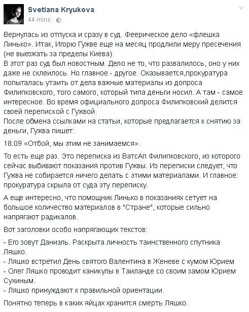 "Во время официального допроса Филипковский делится своей перепиской с Гужвой. После обмена ссылками на статьи, которые предлагаются к снятию за деньги, Гужва пишет: 18:09 "Отбой, мы этим не занимаемся", - написала Крюкова.