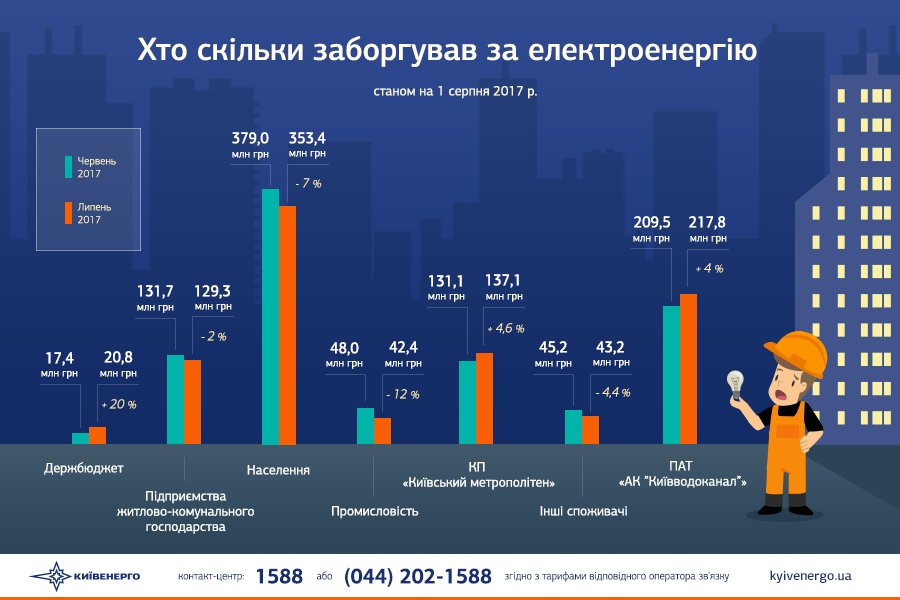 Крупнейший должник ОАО "АК "Киевводоканал" увеличил сумму долга до 217,8 млн гривен, КП "Киевский метрополитен"- до 137,1 млн гривен. Долг населения Киева за потребленную электрическую энергию перед "Киевэнерго" на 1 августа 2017 составляет 353,4 млн гривен.