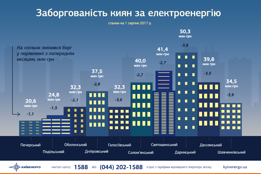 По данным компании, крупнейшими должниками являются потребители Дарницкого, Святошинского и Соломенского районов. Их задолженность на 1 августа 2017 составляет 50,3 млн гривен, 41,4 млн гривен и 40 млн гривен соответственно.