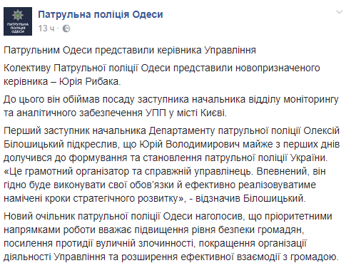 Патрульным Одессы представили нового руководителя – Юрия Рыбака, который сменит Михаила Билецкого. Об этом говорится в сообщении патрульной полиции Одессы в Facebook.