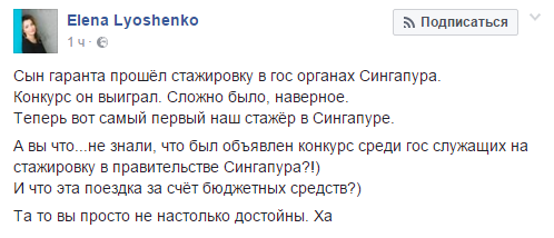 Пользователь Facebook Елена Лешенко иронично интересуется, был ли объявлен конкурс на котором победил сын Порошенко.