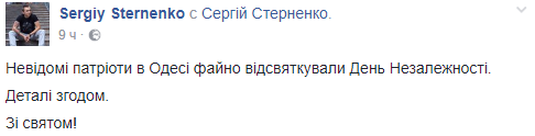 "Неизвестные патриоты в Одессе прекрасно отпраздновали День Независимости", - написал Стерненко.
