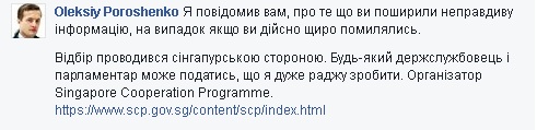 "Я сообщаю вам, о том что вы распространили неправдивую информацию, на случай если вы действительно искренне ошиблись, - написал Порошенко-младший. - Отбор проводился сингапурской стороной"