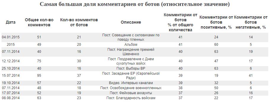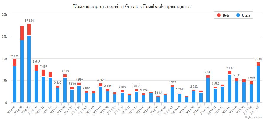 В Facebook президента количество оставлявших комментарии ботов относительно небольшое — 1500 аккаунтов, что составляет около 2% от общего количества комментаторов под постами на официальной странице Порошенко за три года.