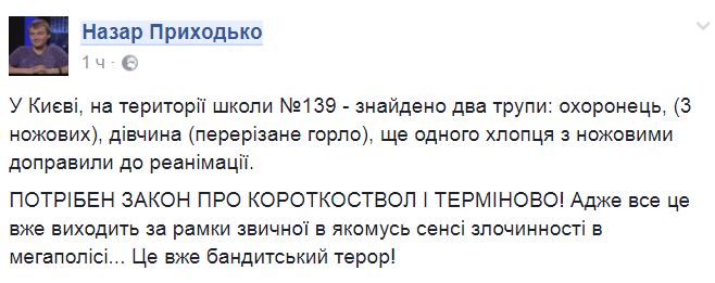 В комментариях позже Приходько добавил, что "это была не бытовуха. Сведения говорят, что это умышленная расправа".