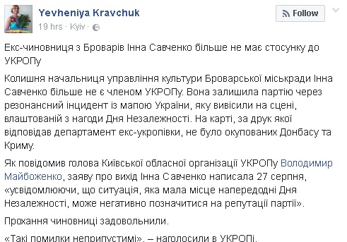 "Бывшая начальница управления культуры Броварского горсовета Инна Савченко больше не является членом УКРОПа. Она оставила партию за резонансный инцидент с картой Украины, которую вывесили на сцене, устроенной по случаю Дня Независимости", - написала она.