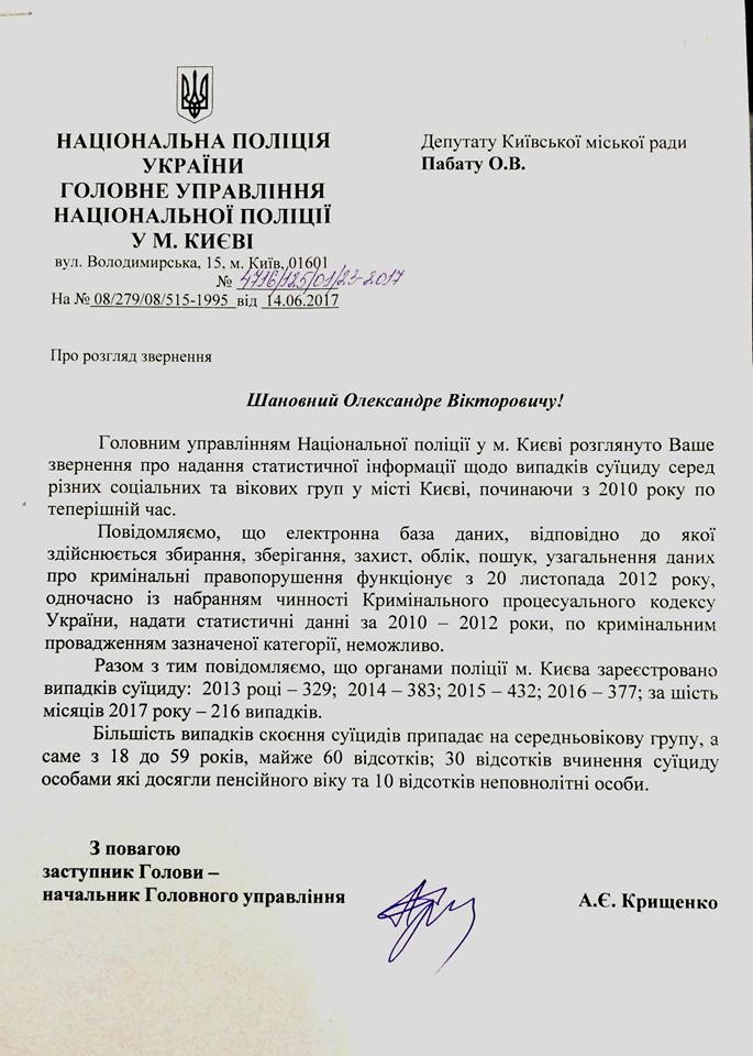 "Органами полиции Киева зарегистрировано случаев суицида: в 2013 году - 329, 2014 - 383, 2015 - 432, 2016 - 377, за шесть месяцев 2017 - 216 случаев", - говорится в ответе на запрос .