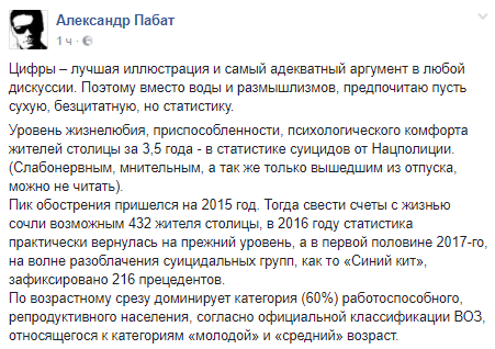 "Пик обострения пришелся на 2015 год. Тогда свести счеты с жизнью сочли возможным 432 жителя столицы, в 2016 году статистика практически вернулась на прежний уровень, а в первой половине 2017-го, на волне разоблачения суицидальных групп, как то "Синий кит", зафиксировано 216 прецедентов. По возрастному срезу доминирует категория (60%) работоспособного, репродуктивного населения, согласно официальной классификации ВОЗ, относящегося к категориям "молодой" и "средний" возраст", - делится размышлениями Пабат, получив ответ на запрос из Нацполиции.