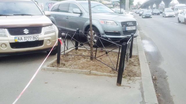 В Подольском районе Киева неизвестные на авто сломали забор вокруг высаженного зеленстроевцами дерева.