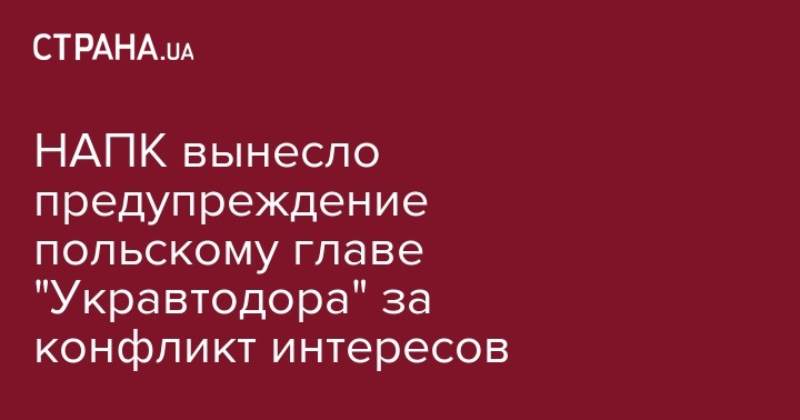 Национальное агентство по предупреждению коррупции (НАПК) выдало предписание о нарушении требований законодательства и.о. председателя Государственного агентства автомобильных дорог Украины ("Укравтодор") Славомиру Новаку. Об этом сообщает пресс-служба агентства.