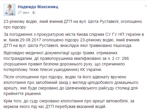 "23-летнему водителю, который совершил ДТП на ул. Шота Руставели, объявлено о подозрении. По согласованию с прокуратурой города Киева следователем Нацполиции в  Киеве 29.08.2017 объявлено подозрение 23-летнему водителю, который совершил ДТП на ул. Шота Руставели, в результате которого травмирован пешеход. Согласно медицинской документации травм, полученных пострадавшим, действия правонарушителя квалифицированы по ч. 2 ст. 286 (нарушение правил безопасности дорожного движения, повлекшее тяжкие телесные повреждения) УК Украины", - говориться в сообщении.
