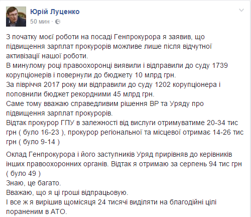 "Оклад генпрокурора и его заместителей правительство приравняло к руководителям других правоохранительных органов. Поэтому я получу за август 94 тыс. грн (было 49). Знаю, это много. Считаю, что я эти деньги отрабатываю", - написал генпрокурор.