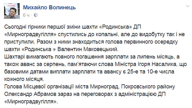 "Шахтеры требуют полного погашения зарплаты за июль месяц, а также аванс за август, помня слова Министра Игоря Насалика, что базовыми датами выплаты зарплаты и аванса являются 25-е и 10-е числа каждого месяца", - написал председатель профсоюза.