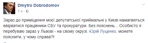 "Сейчас в помещение моей депутатской приемной в Киеве пытаются ворваться работники СБУ и прокуратуры. Без объяснений ... Лично я нахожусь сейчас во Львове - на своем округе. Юрий Луценко, можете объяснить, в чем дело?!" - написал он.