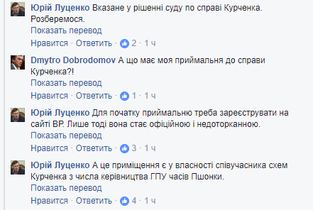 Отвечая на вопрос, какое отношение имеет депутатская приемная к этому делу, генпрокурор ответил: "Для начала приемную надо зарегистрировать на сайте ВР. Только тогда она становится официальной и неприкосновенной. А это помещение в собственности соучастника схем Курченко из числа руководства ГПУ времен Пшонки".