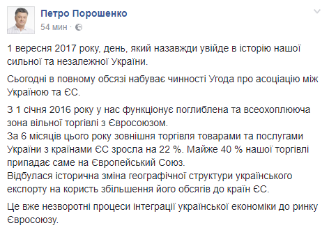1 сентября 2017 года в полную силу вступило Соглашение об ассоциации между Украиной и ЕС. Об говорится в сообщении от имени Петра Порошенко на официальной странице президента в Facebook.