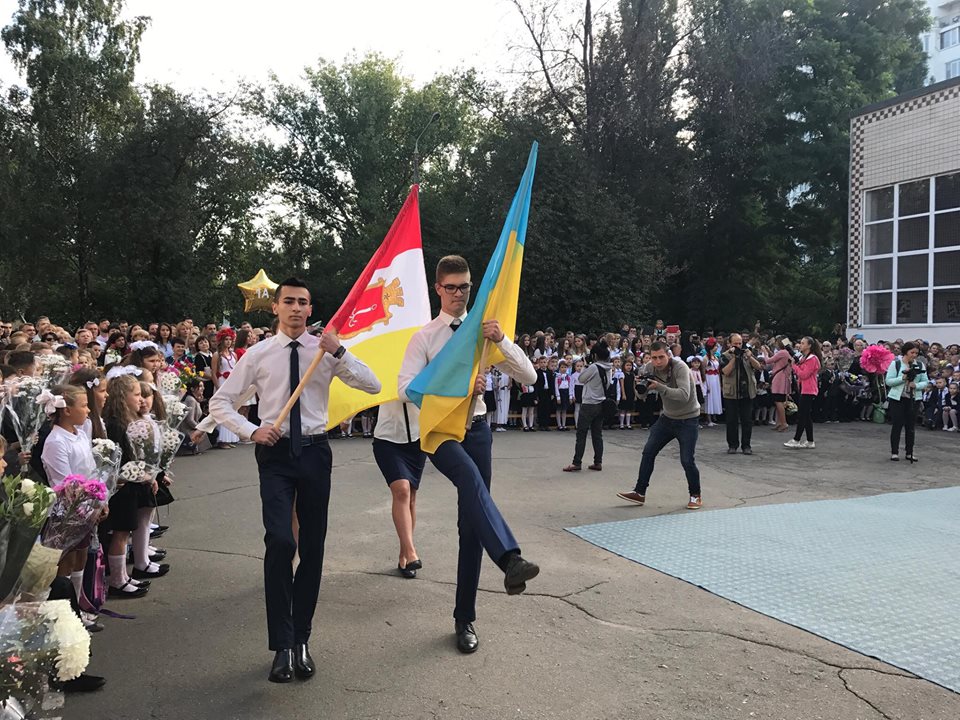 В Одессе на 1 сентября школы подчеркивали не только украинский, но и местный патриотизм. На торжественной линейке вместе с государственным флагом пронесли и знамя города Одессы.