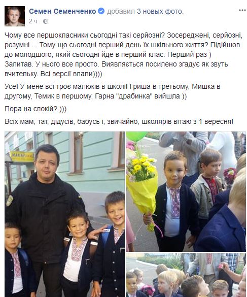 Впрочем, политики в большинстве своем привели в школы детей, одетых в украинском национальном стиле. Так выглядели трое сыновей депутата Семена Семенченко - впрочем, сам нардеп явился в школу в полувоенной одежде черного цвета.