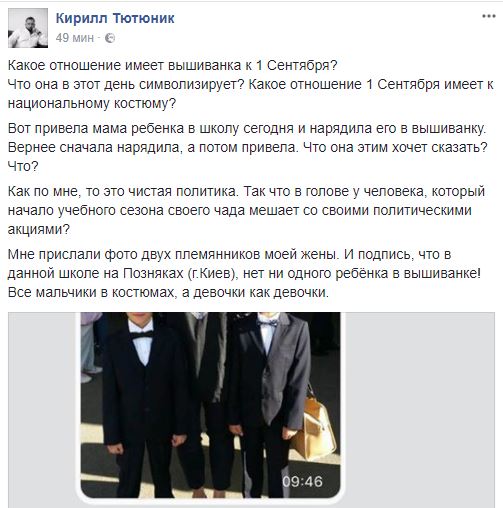 "Мне прислали фото двух племянников моей жены. И подпись, что в данной школе на Позняках (г.Киев), нет ни одного ребёнка в вышиванке! Все мальчики в костюмах, а девочки как девочки", - пишет блогер из Запорожья Кирилл Тютюник.