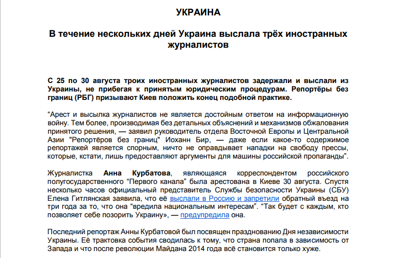 "Репортеры без границ (РБГ) призывают Киев положить конец подобной практике. Арест и высылка журналистов не является достойным ответом на информационную войну. Тем более, производимая без детальных объяснений и механизмов обжалования принятого решения", - заявил руководитель отдела Восточной Европы и Центральной Азии "Репортеров без границ" Иоханн Бир.