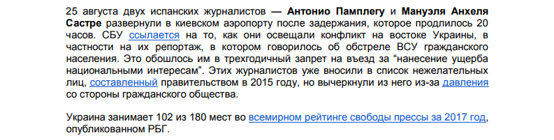 Ранее - 25 августа двух испанских журналистов - Антонио Памплегу и Мануэля Анхеля Састре развернули в киевском аэропорту после задержания, которое продлилось 20 часов.