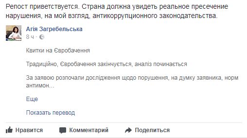 "Антимонопольный комитет Украины открыл производство по делу о билетах на Евровидение. Заявление было подано мной", - сообщает Кравец.