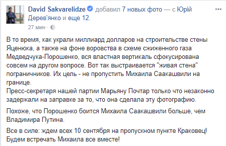 "Вот так выстраивается "живая стена" пограничников. Их цель - не пропустить Михаила Саакашвили на границе. Пресс-секретаря нашей партии Марьяну Почтар только что незаконно задержали на заправке за то, что она сделала эту фотографию", - сообщил Сакварелидзе в Facebook.