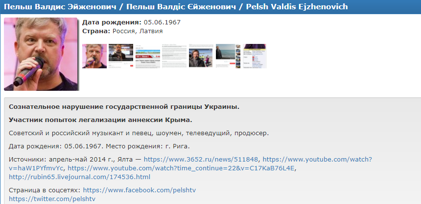 На сайте указано, что Пельша занесли в список за "сознательное нарушение государственной границы Украины", и что он "участник попыток легализации аннексии Крыма".