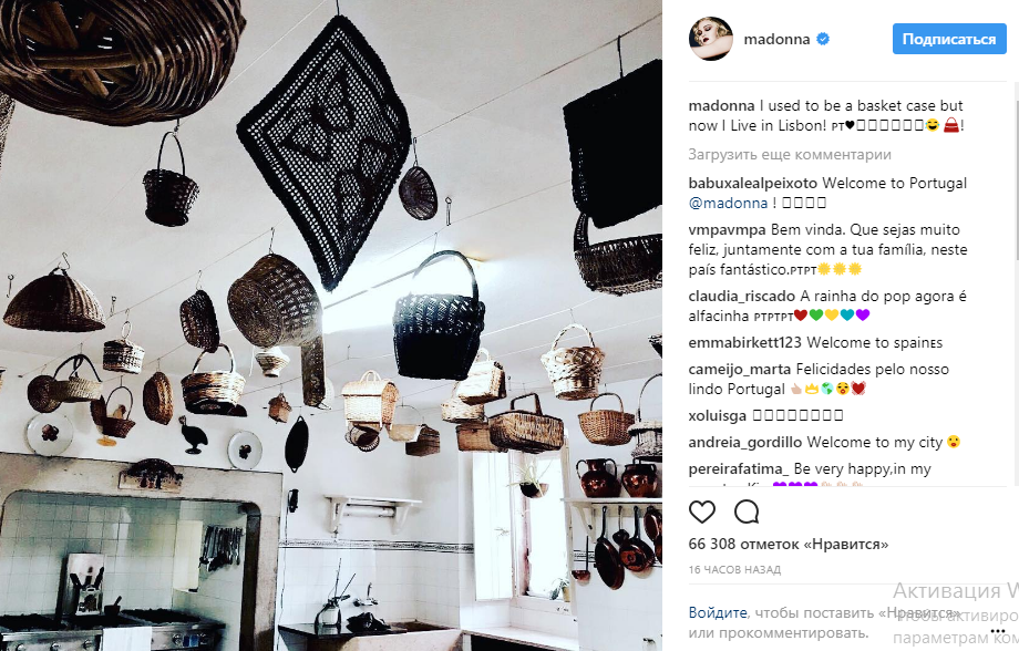 Она обнародовала фото комнаты с плетеными корзинами под потолком и написала: "Я когда-то был корзиной, но сейчас я живу в Лисабоне!".