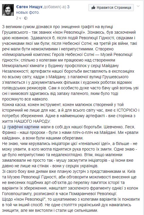 "Эти графические картины несли в себе дух нашей борьбы. Шевченко, Леся, Франко - наши пророки - были с нами бок о бок на Майдане. Мы "рвали цепи", а они были нашими оберегами. Не знаю, чем руководствовались инициаторы этой "гениальной идеи", а больше - не могу представить, у кого могла подняться рука просто их смыть. Одно знаю - это было недопустимо и недальновидно ", - прокомментировал Нищук уничтожение граффити.