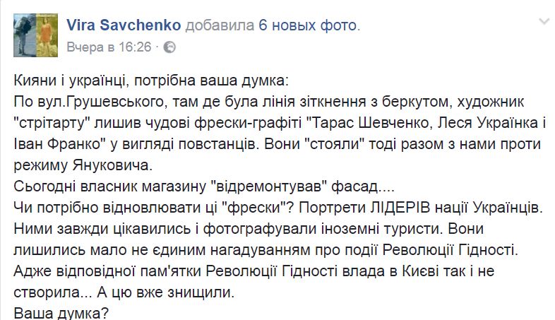 "Сейчас, 15:00, С14 идем в гости. В цивилизованных странах такие настенные памятники иногда приобретают исключительный вес, как напоминание об исторических событиях. Их охраняют законом. В нашем случае бутик с дорогой меблятиною решил, что дутая респектабельность ценнее памяти о триумфе гражданского духа. Рисунки стерли. Зря. Вернем утраченное. Приходите на Грушевского сейчас!", - написал активист.