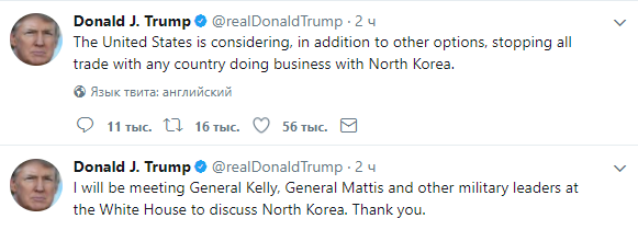 Президент США добавил, что намерен провести общее собрание с министром внутренней безопасности США Джоном Келли, генералами и другими военными лидерами в Белом доме, чтобы обсудить ситуацию по Северной Корее.