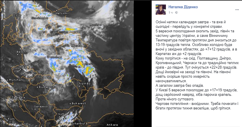 Во вторник, 5 сентября, похолодание охватит запад, север и часть центра Украины, а именно Винницкую область. Температура воздуха в течение дня снизится до 13 градусов тепла. Особенно холодно будет ночью в западных областях, от +7... до +12 градусов.